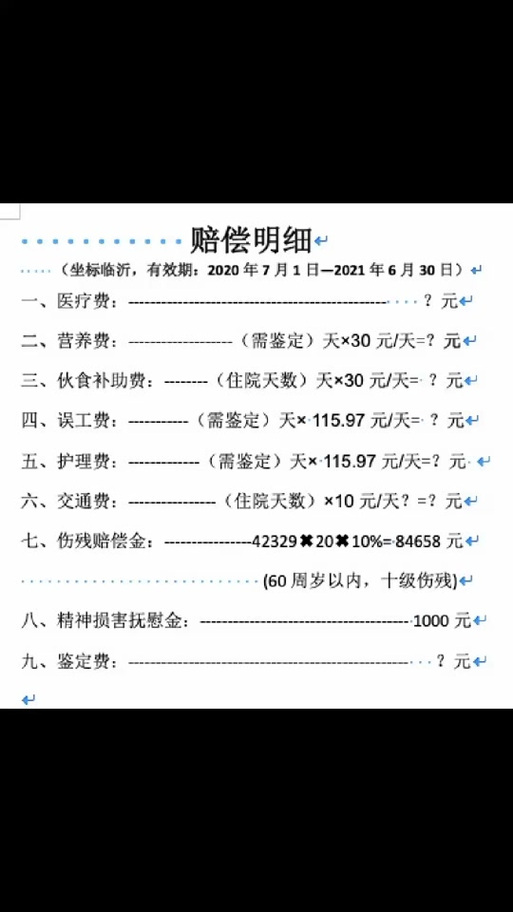 - 经济损失:如因伤无法工作,需赔偿相应的收入损失。
