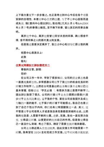 我在XX公司担任XX岗位已经XX个月了,在这段时间里,我对公司的发展和自身的职业规划有了更深入的认识和思考。经过慎重考虑,我决定提出辞职,离开公司。在试用期内离职对公司的工作和管理可能会造成一定程度的困难,我深感抱歉,但我认为这是我自己的职业发展和生活规划所必须做出的选择。