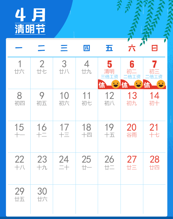 清明节,是咱们中国传统节日之一,又是个扫墓的日子。每到这个节日,我就会陷入两难,既想回家陪伴家人扫墓,又想偷懒在家追剧。今年清明节的放假安排是:4月5日(星期三)放假,与星期日连休,一共放假三天,也就是4月5日、4月6日、4月7日。这是个不错的安排,可以好好享受一下春天的气息。