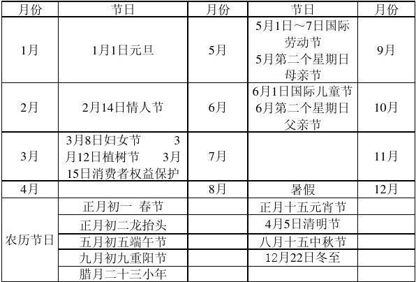 年节假日日历表全年